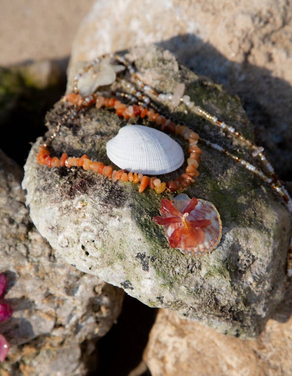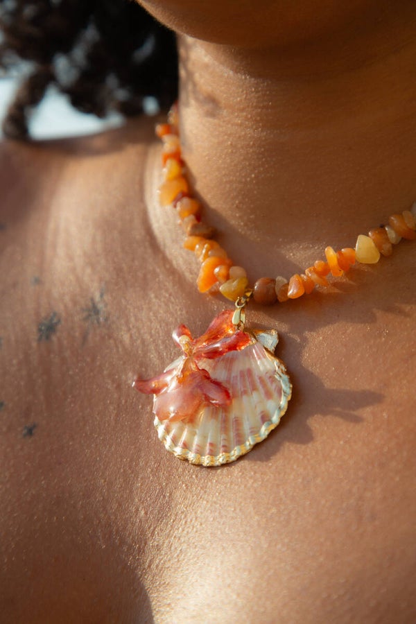 Plonge dans l’univers tropical avec ce collier unique fait main, composé de perles chips en pierre naturelle orange et d’un pendentif coquillage orné d’une orchidée odontocidium. Parfait pour sublimer une tenue d’été avec une touche artisanale et féminine 🌺🐚